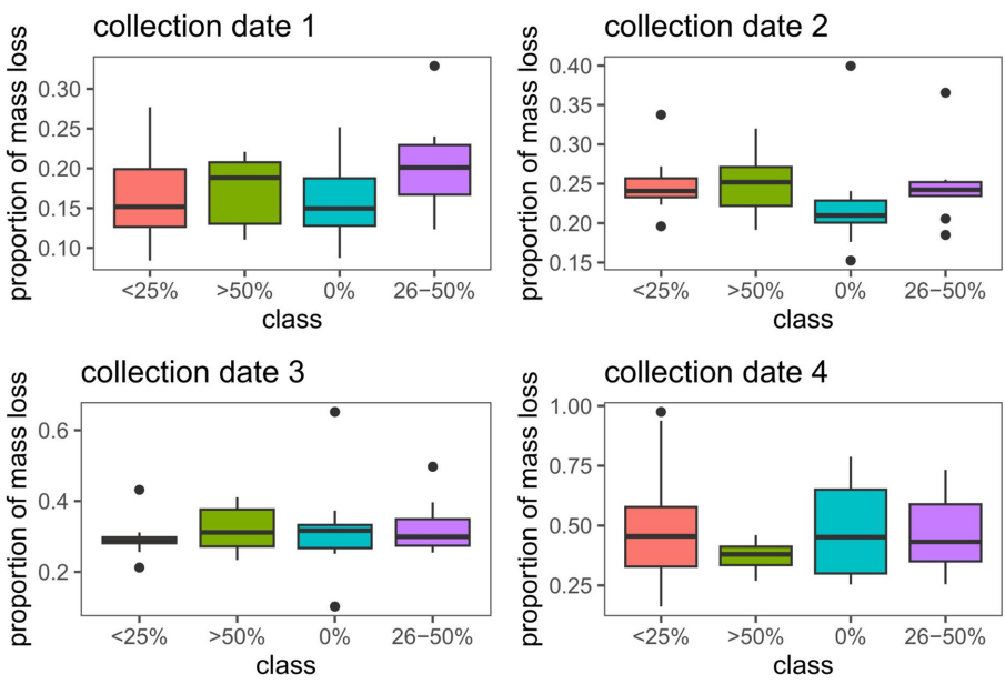 与预期假设相反,加拿大一枝黄花的覆盖度对凋落物质量损失的影响微乎其微。从控制样方(0%覆盖)到高入侵样方(95%覆盖),质量损失率仅从30%轻微下降至28%。这一发现表明,当地生态系统的土壤微生物区系具备同时分解本地植物和入侵植物凋落物的能力,挑战了关于入侵植物会显著改变分解速率的传统认知。
