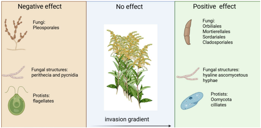传统观点认为,植物入侵会通过改变土壤理化性质(如pH值、有机碳含量和C:N比)来影响分解过程。先前研究表明,加拿大一枝黄花的入侵确实会改变丛枝菌根真菌(AMF)的群落组成,并提高真菌总生物量。但在真实自然环境中,关于不同微生物功能群对其凋落物分解的具体贡献,特别是真菌与原生生物的相对重要性,仍存在认知空白。更令人困惑的是,尽管加拿大一枝黄花在东亚水生环境中表现出比本地植物更快的分解速率,但在陆地生态系统中,其分解规律却显得更加复杂难测。