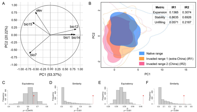 主成分分析显示前两轴累计解释环境变异的73.59%。番茄潜叶蛾在两类入侵范围中均出现不同程度的生态位扩张,但以中国范围内更为明显。生态位等效性与相似性检验进一步证实了中国入侵种群发生了更显著的生态位转移,其Schoener’s D值更低、相似性检验P值更严格。