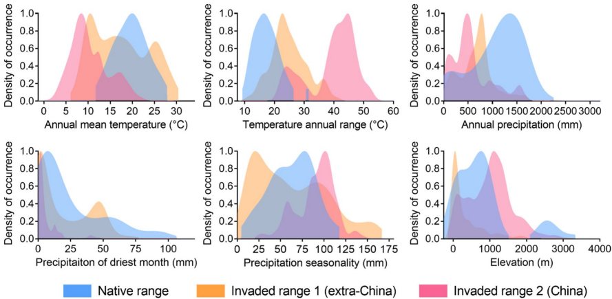 除最干月降水量外,番茄潜叶蛾在入侵地区的气候条件范围均宽于原生地。入侵种群特别是中国的种群,温度范围更广,涵盖更低的年平均温和更大的年温差;降水范围虽相当,但入侵生态位中年降水量和最干月降水的高密度区偏向更干旱条件。