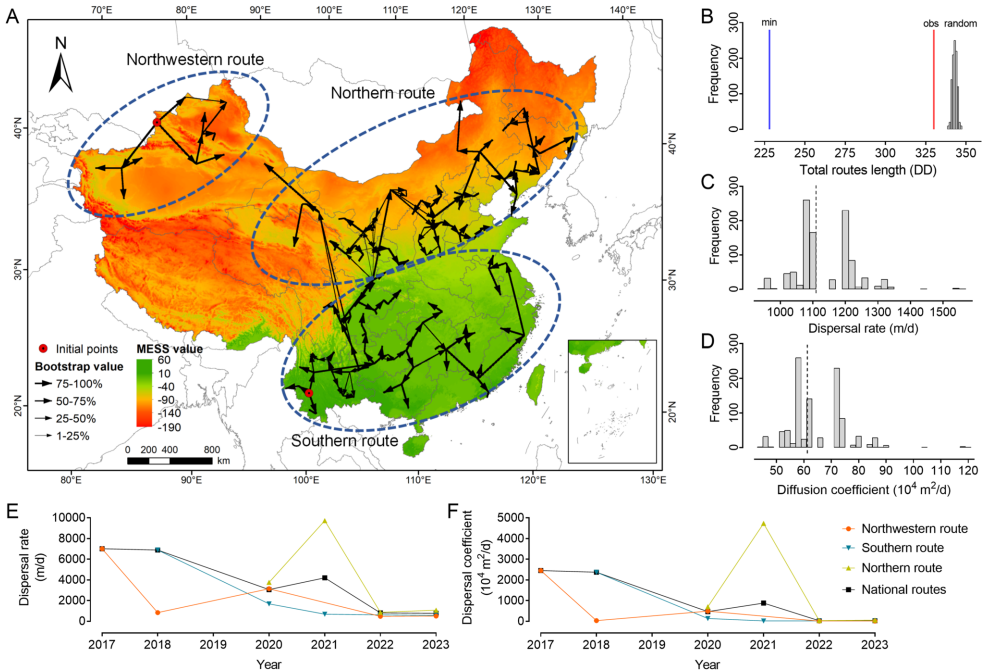 本期推荐研究人员针对番茄潜叶蛾(Tuta absoluta)入侵中国后的扩散路径及生态位动态开展系统研究,整合全国监测数据与数学模型,揭示其双走廊扩散机制及显著的气候生态位扩张现象,为农业生物安全及害虫防控策略提供关键科学依据。