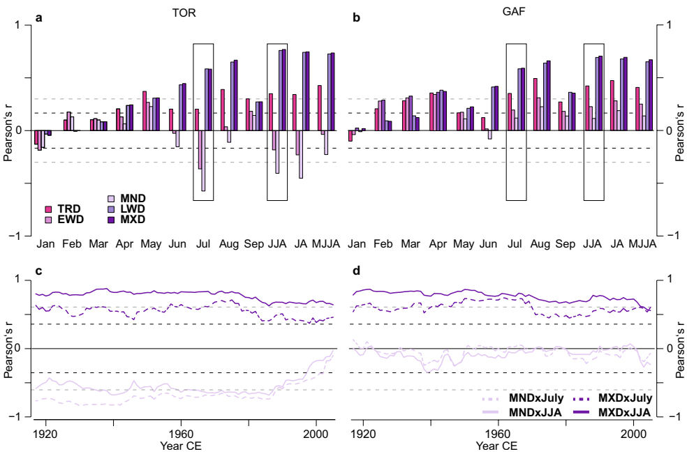 在两个站点,老年年表在过去四十年(1981-2020)的温度相关性较前四十年(1941-1980)有所下降,但仅TOR MND和GAF MXD的差异具有统计显著性。TOR MND信号在两个时期之间显著恶化,从7月的-0.69降至-0.14,JJA从-0.60降至-0.29。