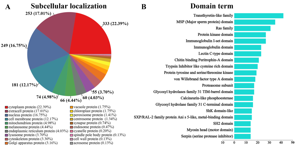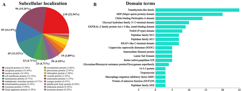 对899个差异性表达蛋白(PDAs)的分析显示,110个胞外蛋白中存在显著性别差异(68个雌性上调,42个雄性上调)。转录因子鉴定发现7个差异性TF蛋白,包括ZBTB、CSD和MYB家族成员。结构域富集分析显示转运甲状腺素蛋白样家族结构域(25个蛋白)和MSP结构域(20个蛋白)最为显著,表明这些蛋白可能在性别特异性功能中发挥重要作用。