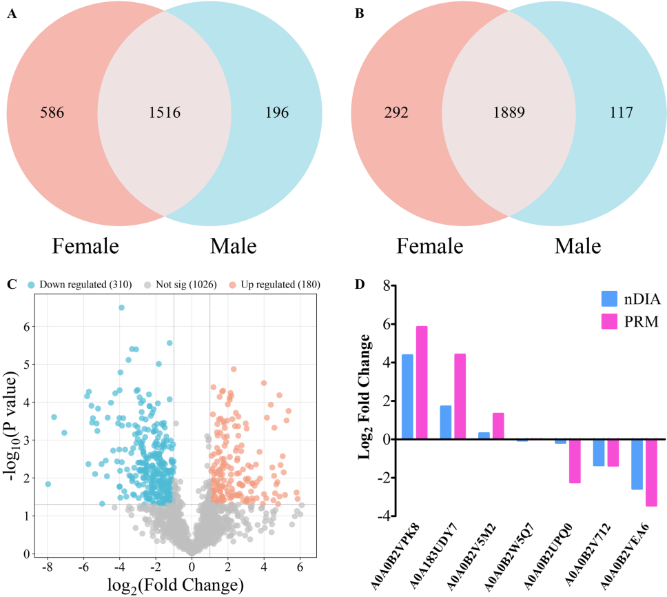 研究通过高精度质谱技术鉴定到2,513个ES蛋白,其中1,516个为雌雄共有蛋白。性别特异性分析显示292个雌性特有蛋白和117个雄性特有蛋白,表明两性在生理功能上存在显著差异。主成分分析(PCA)显示雌雄样本明显分离,蛋白质表达谱具有高度性别特异性。通过平行反应监测(PRM)验证了七种代表性蛋白的表达趋势,证实了蛋白质组数据的可靠性。