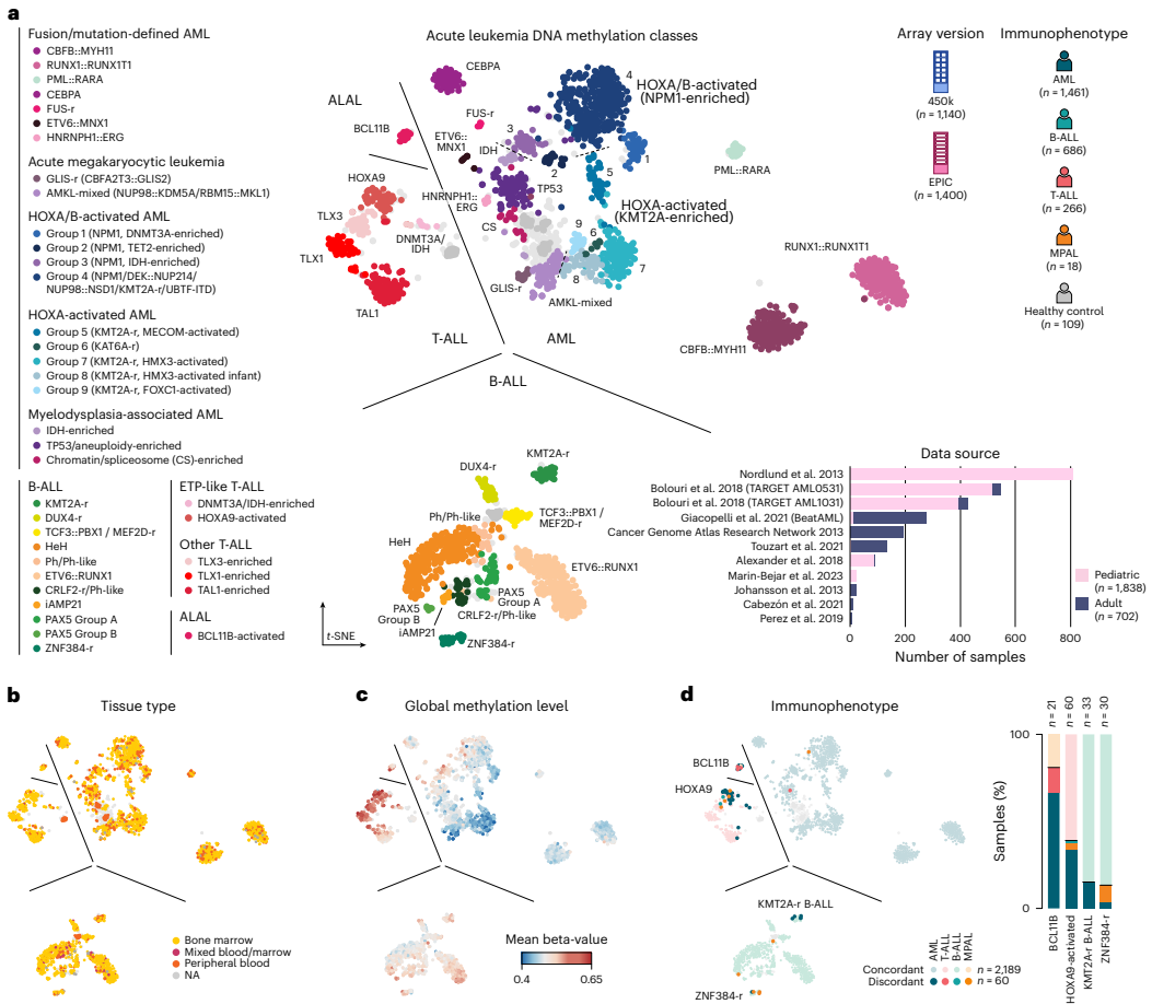 在这项发表于《Nature Genetics》的研究中,研究团队建立了急性白血病DNA甲基化参考队列,包含2,540个高质量样本,来自11个已发表的甲基化阵列数据集。通过t-SNE降维分析,研究人员观察到样本按谱系清晰分离,并在各谱系内部发现显著的表观遗传异质性。最终定义了38个甲基化类别,其中25个与既往研究一致,4个通过细分现有类别产生,9个为首次报道。值得注意的是,甲基化分类与免疫表型分型结果高度一致(97.3%吻合),但对于混合表型急性白血病(MPAL) cases,71.4%被重新分类为单一谱系,表明甲基化特征更能反映分子驱动而非表面标志物。