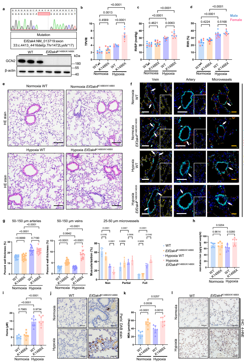在肺动脉高压疾病谱中,肺静脉闭塞性疾病(Pulmonary Veno-Occlusive Disease, PVOD)是一种罕见却致命的亚型,其特征为肺小静脉进行性闭塞和含铁血黄素在巨噬细胞中的异常沉积。虽然既往研究发现在家族性和散发性PVOD患者中存在General Control Nonderepressible 2(GCN2, 由EIF2AK4基因编码)的双等位基因突变,但GCN2缺陷如何影响肺静脉细胞及其微环境的具体机制仍不明确。更严峻的是,目前除肺移植外尚无有效治疗方法,患者诊断后中位生存期不足两年,这凸显了揭示其分子机制并开发靶向疗法的紧迫性。