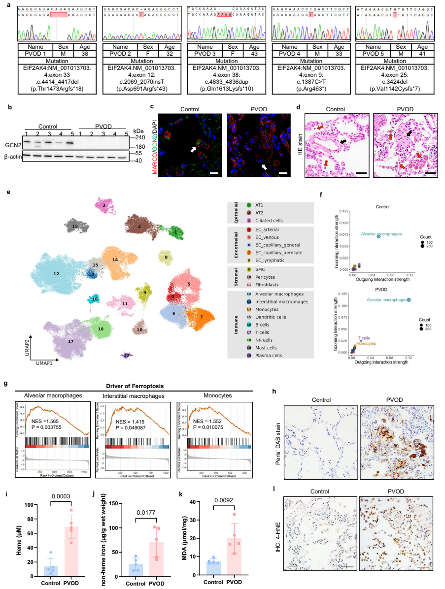 通过对PVOD患者肺组织的免疫组化和scRNA-seq分析,发现GCN2蛋白表达缺失,且巨噬细胞是主要受累细胞群。基因集富集分析显示,巨噬细胞中铁死亡通路基因显著上调。普鲁士蓝染色证实患者肺组织铁沉积增加,脂质过氧化产物MDA和4-HNE水平升高,提示铁死亡激活。
