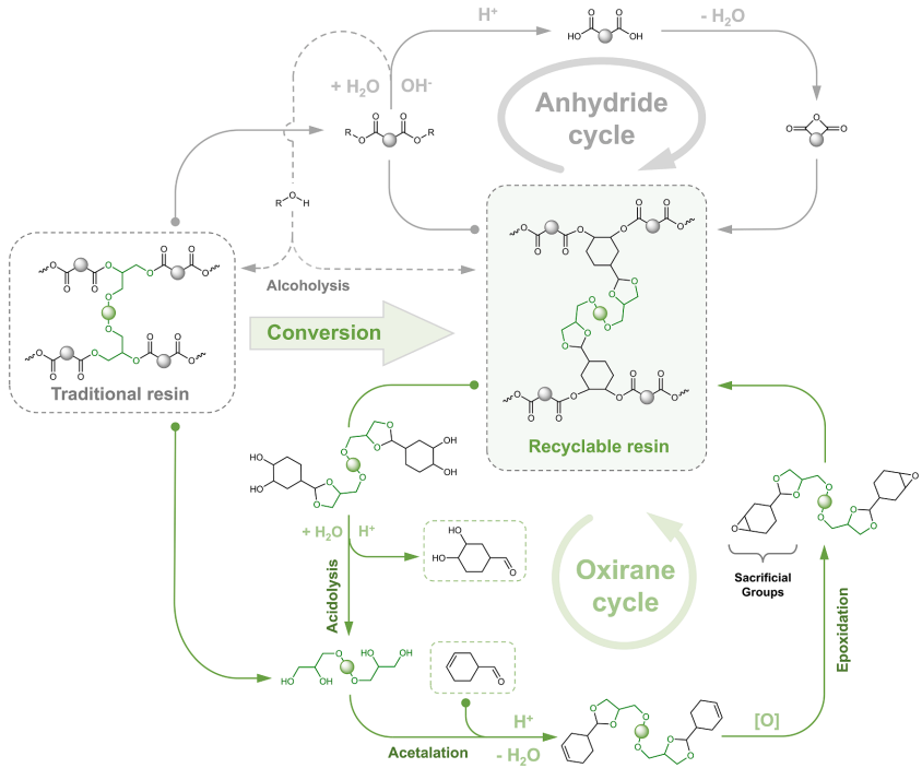 更令人担忧的是,虽然过去十年间科学家们开发了可重塑环氧树脂(reprocessable epoxy vitrimers)和升级回收等新技术,但这些方法仍无法实现真正的化学闭环循环,材料最终还是会逐渐累积成为难以再利用的废弃物。特别是在电气绝缘领域广泛应用酸酐固化环氧树脂(anhydride-cured epoxy resins),其酯键的不可逆特性使得回收聚醇降解产物并重新转化为环氧化合物变得异常困难。传统方法需要使用高活性试剂(如二乙基偶氮二甲酸酯),不仅容易产生副反应,原子经济性也较差。