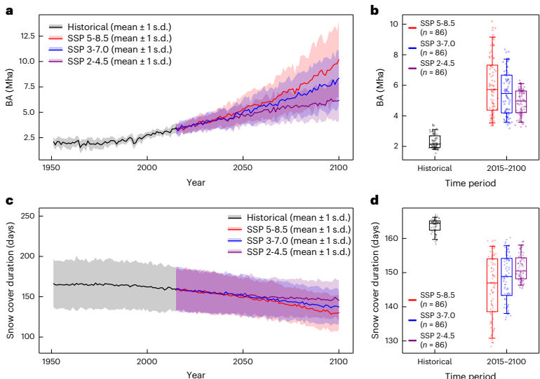本刊推荐:为揭示北极地区积雪动态对野火的响应机制,研究人员通过卫星观测与机器学习模型(XGBoost)开展多尺度分析,发现野火通过降低反照率(albedo)和升高地表温度(LST)使积雪形成延迟超5天,预测SSP5-8.5情景下至2100年燃烧面积(BA)将增2.6倍、积雪期缩短18天。该研究为理解冰冻圈-火灾反馈环路提供关键证据。
