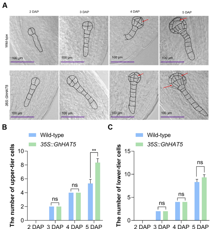 研究人员通过形态学观察发现,在胚胎发育早期(5 DAP),35S::GhHAT5植株的顶端胚胎上胚层细胞已经开始显著分裂,而野生型植株的相应细胞尚未开始明显分裂。到6 DAP时,35S::GhHAT5胚胎已经显示出明显的子叶原基,而野生型胚胎则缺乏子叶原基。测量数据显示,在4-6 DAP期间,35S::GhHAT5胚胎的上胚层细胞面积显著大于野生型,特别是在5 DAP和6 DAP时差异最为显著。在7 DAP和8 DAP时,35S::GhHAT5胚胎的子叶面积也显著大于野生型。这些结果表明GhHAT5异位表达能够促进拟南芥胚胎发生过程中顶端胚胎上胚层细胞和胚胎子叶的发育。