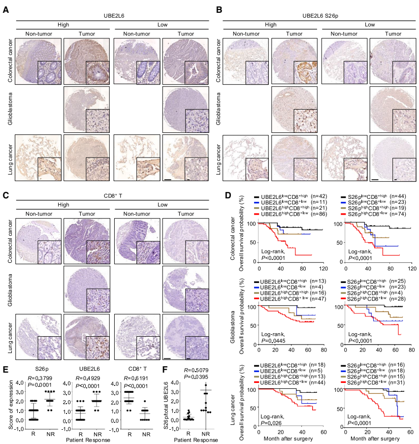 RSK抑制剂PMD-026(目前处于I/Ib期临床试验)处理显著增强肿瘤对PD-1阻断和放疗的敏感性,该效应依赖UBE2L6。临床数据分析显示RSK1(而非RSK2)高表达与非小细胞肺癌和结直肠癌患者的免疫治疗耐药相关。UBE2L6及其磷酸化水平在多种癌症组织中升高,与CD8+ T细胞浸润负相关,且高表达患者预后较差。