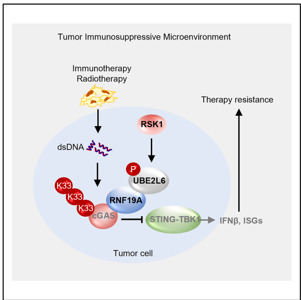 本研究揭示了肿瘤细胞内在免疫逃避的新机制:RSK1介导的UBE2L6磷酸化及UBE2L6-RNF19A驱动的cGAS泛素化形成免疫抑制信号轴。这一发现不仅解释了为何干扰素诱导的基因产物UBE2L6在某些情况下反而发挥免疫抑制作用,更重要的是为克服免疫治疗耐药提供了新的联合治疗策略。