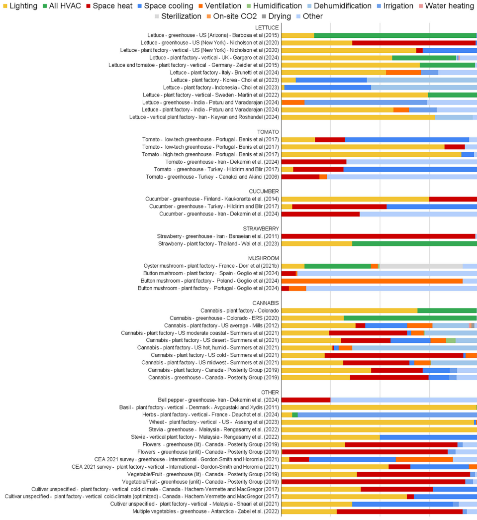 分析揭示了CEA能源使用和效率模式的巨大差异。虽然最高产量通常出现在无窗多层植物工厂中,但温室通常每单位产量的能耗要低得多。能耗强度最低的是简单的"开放式"温室(即机械设备和人工照明最少)。逐步提高产量可能导致收益递减和其他意外环境影响。
