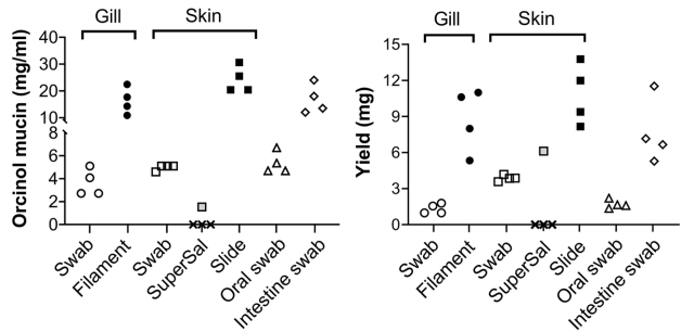 研究发现棉拭子在所有采样场景中表现最为均衡:既能从皮肤、口腔、鳃和肠道获取足量样本,又有效避免了Super·SALTM在大型鱼类应用中的局限性(条形码显色机制需≥1.0 mL黏液)和玻璃片刮取易导致的组织损伤问题。特别在口腔采样中,拭子法成功规避了食物残渣污染,而肠道样本采集通过手术器械辅助实现了黏膜层与内容物的精细分离。
