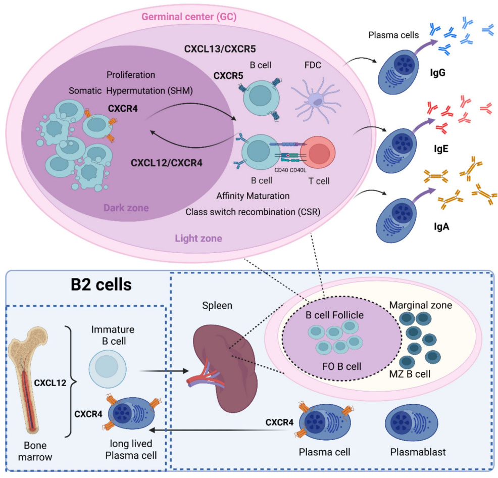 在生发中心反应中,CXCR4/CXCL12与CXCR5/CXCL13梯度共同维持暗区(增殖与体细胞高频突变)与明区(亲和力成熟与类别转换)的空间分隔。成功完成类别转换重组(CSR)与亲和力成熟的B细胞最终分化为记忆B细胞或浆细胞,后者通过上调CXCR4归巢至骨髓并长期存活。