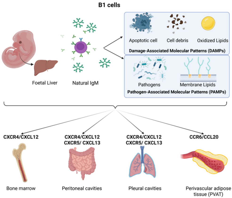 B1细胞主要来源于胚胎期肝脏,定居于体腔(如腹膜、胸膜)及血管周围脂肪组织(PVAT)。其迁移至PVAT由CCR6/CCL20轴介导,而向体腔及骨髓的归巢则依赖于CXCR4/CXCL12与CXCR5/CXCL13信号。