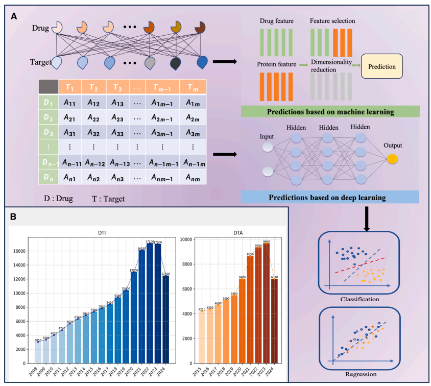 亲和力预测通常被表述为一个回归任务,需要复杂的模型来准确量化药物和靶点之间的结合强度。尽管DTI和药物-靶点亲和力(DTA)预测关注药物开发的不同方面,但它们是互补且关键的。DTI通过识别潜在相互作用为药物发现提供基础,而DTA预测则为优化药物特性提供详细见解。DTI和DTA预测任务都吸引了越来越多的兴趣和大量的研究投资。Figure 1概述了使用机器学习方法进行DTI和DTA预测所涉及的步骤(A),并说明了近年来关于DTI和DTA的研究数量(B)。
