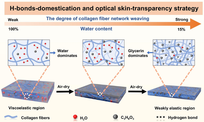 微塑料污染和环境污染是塑料行业两大挑战,本研究通过预处理天然皮肤并整合水介导氢键驯化与光学透明策略,开发出不含微塑料的透明生物基塑料(MCBP)。该材料保留天然皮肤的纤维三维网络结构,具备可生物降解性、高机械强度及形状记忆特性,通过调控甘油和水分比例优化氢键排列,减少光散射并实现光学透明。MCBP不仅实现零微塑料生产,还能吸附去除生命周期中的微塑料,同时作为活性食品包装可显著延长食品保质期,具有广泛的应用潜力。