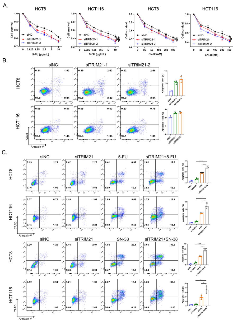 TRIM21敲增强CRC细胞的化疗敏感性:TRIM21敲降增强不同浓度5-FU或SN-38对CRC细胞增殖的抑制效果。相对低浓度5-FU(0.625μg/mL)或SN-38(25 nM)与TRIM21敲降联合进一步增加凋亡细胞数量,效果优于单独处理。在5-FU耐药细胞系(HCT8-5FU)中,TRIM21敲降的抑制效果不明显。