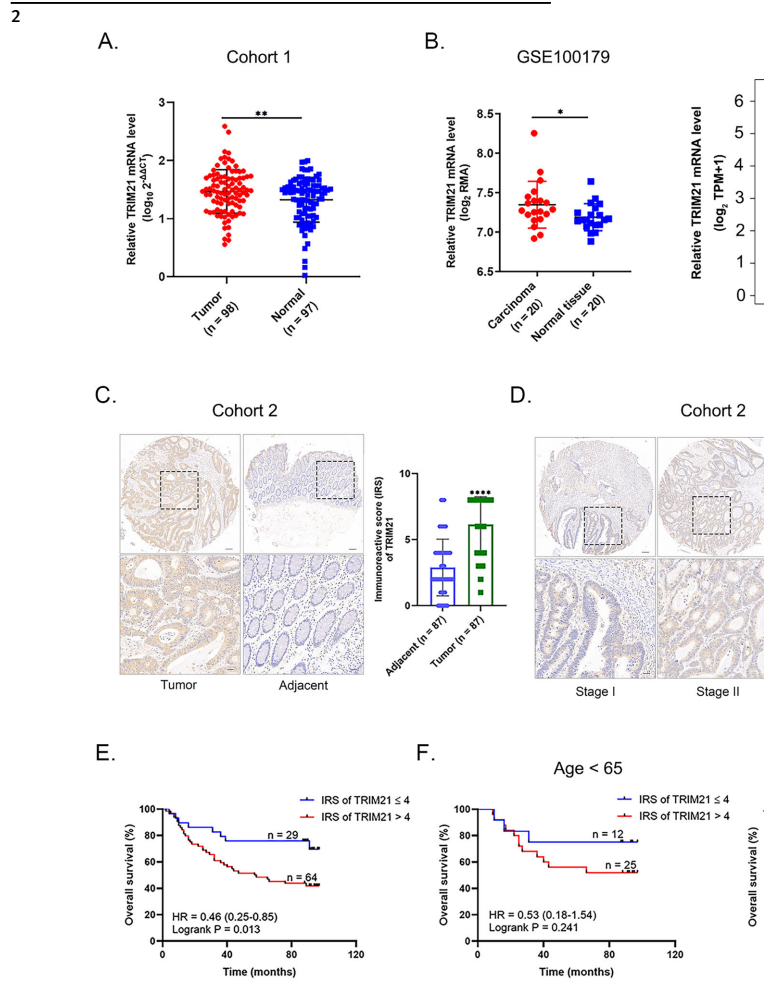 TRIM21水平与CRC患者临床病理特征和预后相关:在Cohort 1中,CRC组织TRIM21 mRNA水平显著高于正常组织,GEO和GEPIA数据库分析结果一致。免疫组化显示CRC组织中TRIM21蛋白水平显著高于癌旁正常组织,且AJCC III期组织中的TRIM21蛋白水平明显高于I期和II期。Kaplan-Meier生存分析显示TRIM21蛋白水平与CRC患者总生存期(OS)负相关,尤其在≥65岁患者中更为明显。