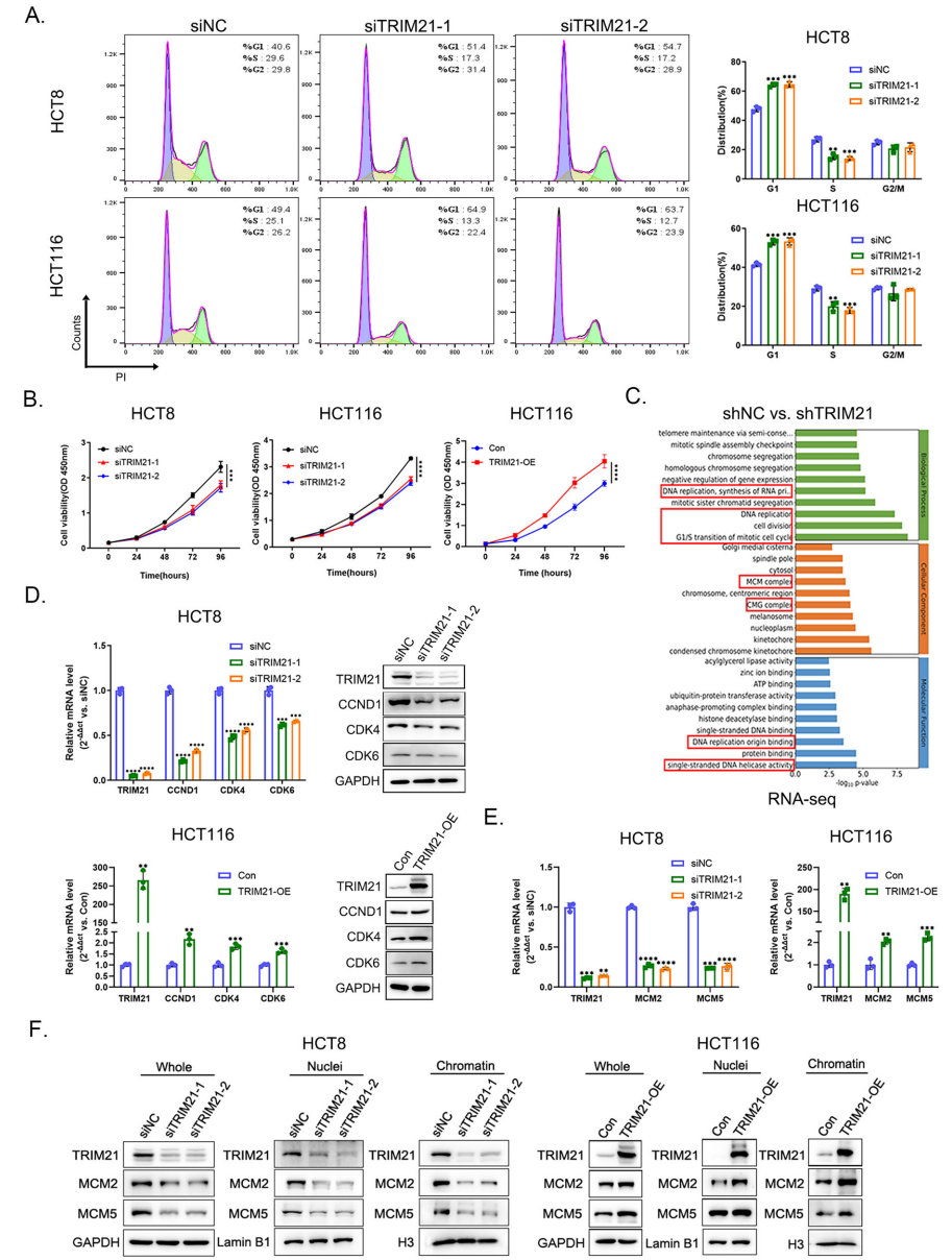 TRIM21调控CRC细胞增殖并与DNA复制相关:TRIM21敲降诱导G1期阻滞并减少S期细胞比例,抑制细胞增殖,而过表达促进细胞生长。RNA测序的Gene Ontology分析显示差异表达基因显著富集于G1-S期转换和DNA复制通路。TRIM21正调控CCND1、CDK4和CDK6表达,并在细胞核和染色质组分中正调控MCM2和MCM5表达。