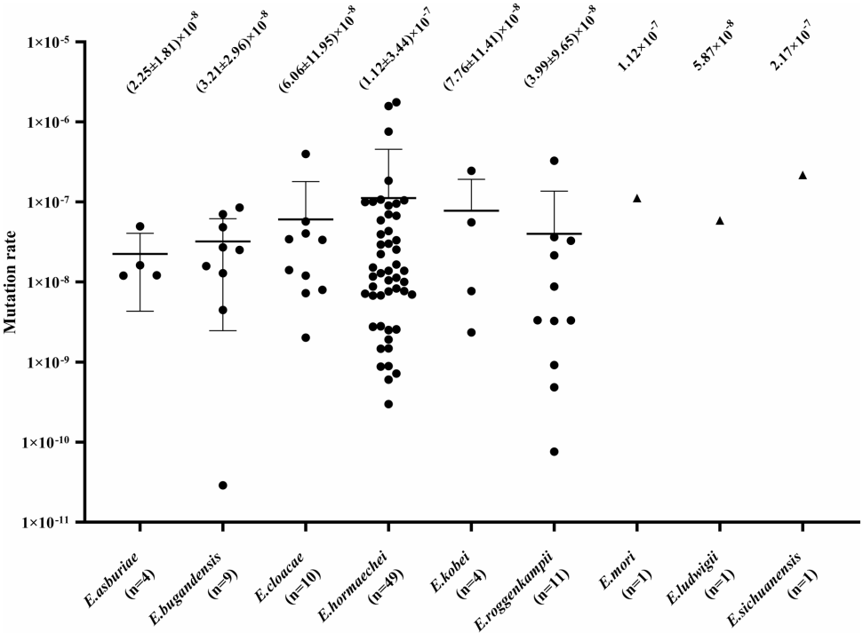本研究针对阴沟肠杆菌复合体(ECC)在使用三代头孢菌素(3GCs)治疗过程中因ampC去抑制突变导致耐药的问题,通过hsp60分型和PCR技术鉴定物种与ampC基因型,并采用Luria-Delbruck波动分析测定突变率。结果显示ECC各物种和ampC基因型(blaACT、blaMIR、blaCMH)均呈现高突变率(10-8量级),无显著差异,提示3GCs治疗含诱导型AmpC的ECC感染存在高风险,为临床抗生素选择提供重要依据。