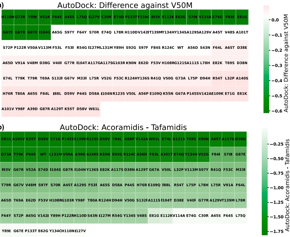本研究针对甲状腺素运载蛋白淀粉样变性(ATTR)中不同TTR突变对稳定剂(如tafamidis和acoramidis)响应差异的难题,开发了结合AlphaFold3、ESM2、DiffDock-L和DiffSBDD的计算生物学流程,揭示了突变特异性结合模式,并通过生成式设计获得变异感知配体,为ATTR的精准药物设计提供了新范式。