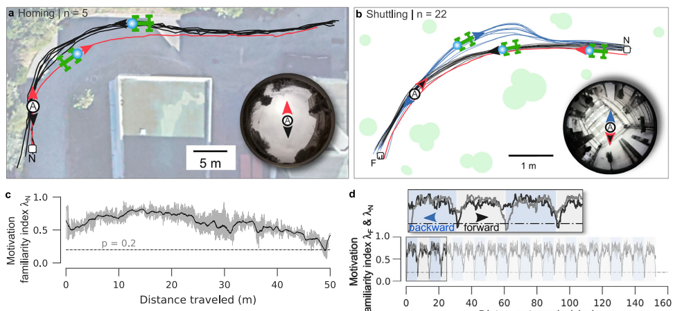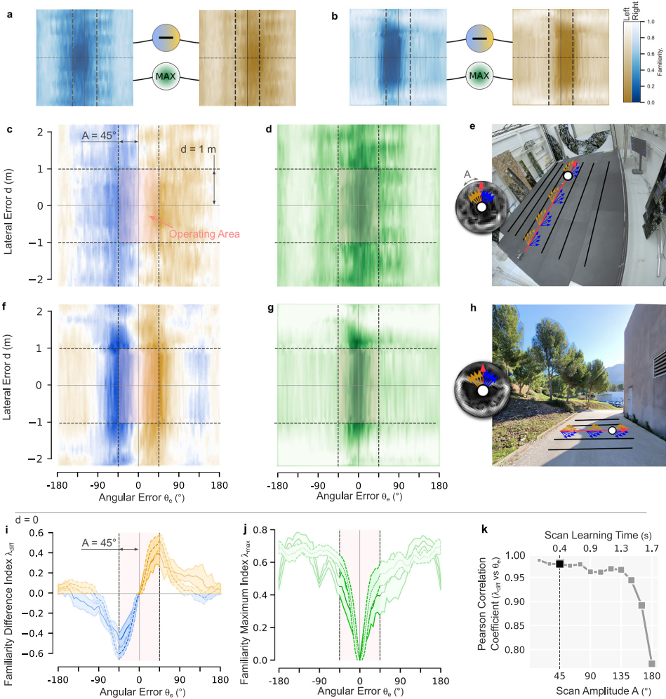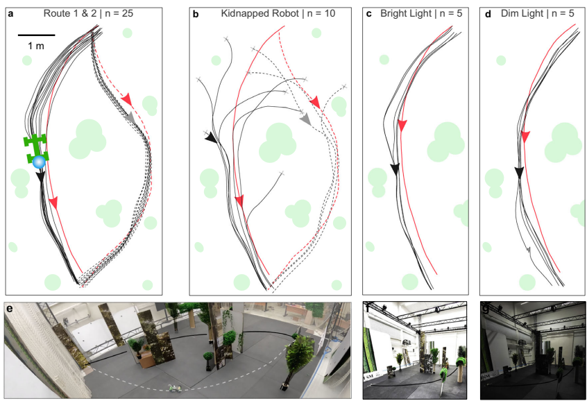 本研究针对自主导航机器人资源受限下的长距离路径跟随难题,受蚂蚁高效导航机制启发,提出了一种基于路径中心化侧向记忆的全景路由学习与跟随神经形态模型。研究团队在Antcar类车机器人上实现了双向路径导航、端点识别及 familiarity 自适应速度控制,通过李雅普诺夫稳定性分析与大规模实证测试(113次试验,总里程1.6 km),证实系统在仅需800像素输入、300 MB内存和18.75 kB/50米路由的极低资源消耗下,实现中位横向误差<25 cm的性能突破,为昆虫认知研究与资源约束下的自主机器人技术提供了重要理论与实践支撑。