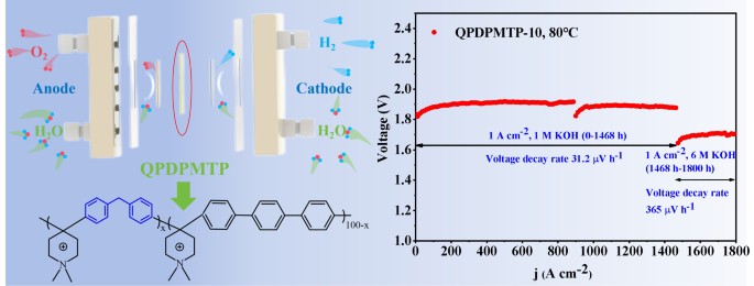 聚(三联苯-二苯基甲烷哌啶鎓)阴离子交换膜与非贵金属电极结合使用,可实现高性能的水电解