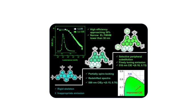 OLED通过整合spiro锁闭结构和侧链取代提升绿光发射效率与色纯度,EQE达29.5%和24.4%,CIE色坐标(0.20,0.71)和(0.18,0.72)符合BT.2020标准。