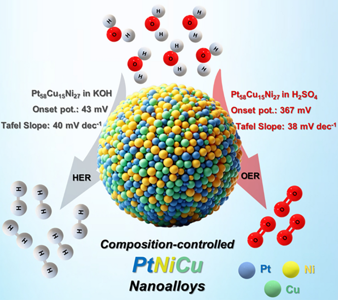 采用一锅法改性的多元醇方法合成了不同Pt/Cu/Ni比例的三元PtCuNi纳米合金,并详细研究了它们在氢演化反应(HER)和氧演化反应(OER)中的电催化性能。通过Rietveld精修和X射线衍射(XRD)分析对合成的PtCuNi纳米合金进行了结构分析,确认它们具有面心立方(fcc)—Fm\(\overline{3 }\)m空间群的立方晶体相。随着Pt比例的增加,晶格常数增大至3.712 ?,晶粒尺寸减小至1.59 ± 0.39 nm。所有制备的纳米合金均呈现均匀的球形,平均粒径在3至9 nm之间。平均粒径为3.62 nm的Pt58Cu15Ni27纳米催化剂在碱性和酸性介质中的HER区域的塔菲尔斜率(Tafel slope)分别为40 mV dec?1和62 mV dec?1。在?0.3 mV(相对于RHE)的条件下,对Pt58Cu15Ni27纳米催化剂在酸性和碱性溶液中的进行 chronoamperometry 测试,结果显示其具有优异的循环稳定性。该催化剂在碱性溶液中的OER过电位(η)最低,为1.36 V(电流密度为10 mA cm?2)。而Pt9Cu39Ni52催化剂在碱性和酸性介质中的OER塔菲尔斜率分别为30 mV dec?1和44 mV dec?1。PtCuNi纳米催化剂电催化活性的提高归因于Cu和Ni向Pt的电子转移,这有助于稳定Pt,并在水中分解过程中促进HO–H键的断裂。
