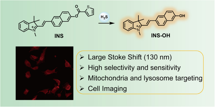 硫化氢荧光探针INS的合成与细胞靶向检测研究:该探针通过特异性硫醇基团与H?S的 nucleophilic reaction实现选择性检测,具有30.1 nM超低检测限、130 nm大斯托克斯位移及pH 5-12宽域稳定性,能高效渗透细胞膜并靶向定位至线粒体和溶酶体。