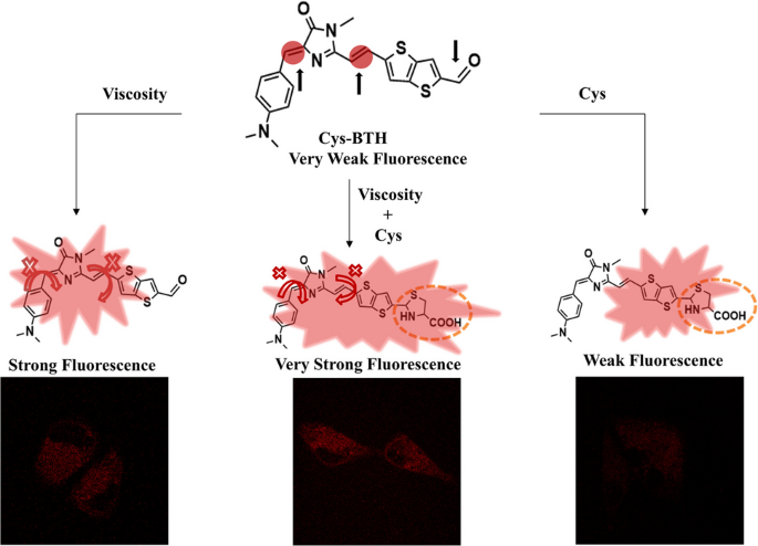 新型近红外荧光探针Cys-BTH通过结合半胱氨酸与高粘度环境实现“与”逻辑门检测,为研究细胞中两者协同作用提供工具,活细胞成像验证其应用价值。
