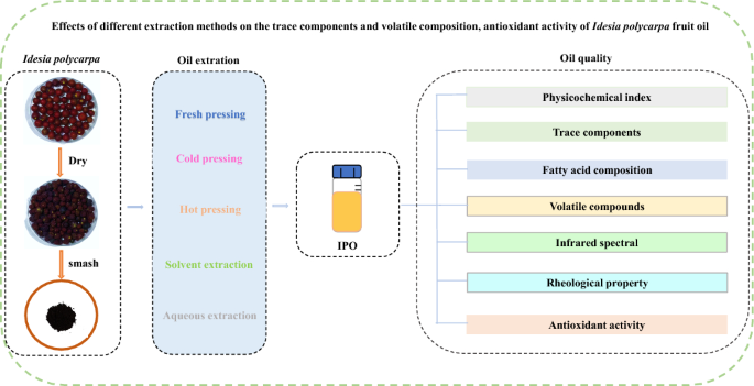五种提取方法对Idesia polycarpa油质量的影响研究表明,溶剂提取油效率最高,但新鲜压榨油酸值和过氧化值最低,保留率高的有益成分(α-生育酚、角鲨烯等),且水提油抗氧化能力最优,通过分析挥发物和正交偏最小二乘判别法鉴定出14个关键生物标志物。