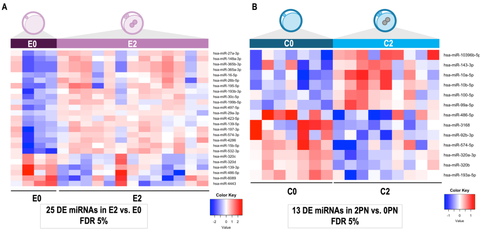 本研究针对子宫内膜异位症(E)相关不孕症患者卵母细胞质量评估难题,通过小RNA测序技术首次系统分析了E患者与对照(C)人群卵丘细胞(CCs)的miRNA表达谱。研究发现E显著改变CCs中85个miRNAs表达,并鉴定出27个与受精潜能相关的关键miRNAs。特别值得注意的是,研究首次揭示了E患者中仍能成功受精卵母细胞的特异性miRNA特征(6个miRNAs)。靶基因分析表明这些miRNAs调控卵母细胞减数分裂、孕酮介导的成熟通路、胚胎发育、线粒体功能等重要生物学过程,为开发非侵入性诊断工具和改善辅助生殖(ART)结局提供了新视角。