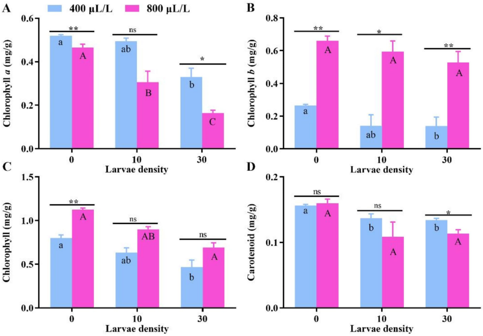 本研究针对大气CO2浓度升高(eCO2)背景下韭菜作物受迟眼蕈蚊(Bradysia impatiens)侵害的生理响应机制展开研究。通过设置400/800 μL/L CO2浓度梯度与0/10/30头幼虫侵染强度的双因子实验,发现eCO2显著提升韭菜叶片宽度、可溶性糖和叶绿素b含量,但降低可溶性蛋白与叶绿素a水平。研究揭示了气候变化背景下植物-昆虫互作的新规律,为制定可持续农业害虫防控策略提供理论依据。