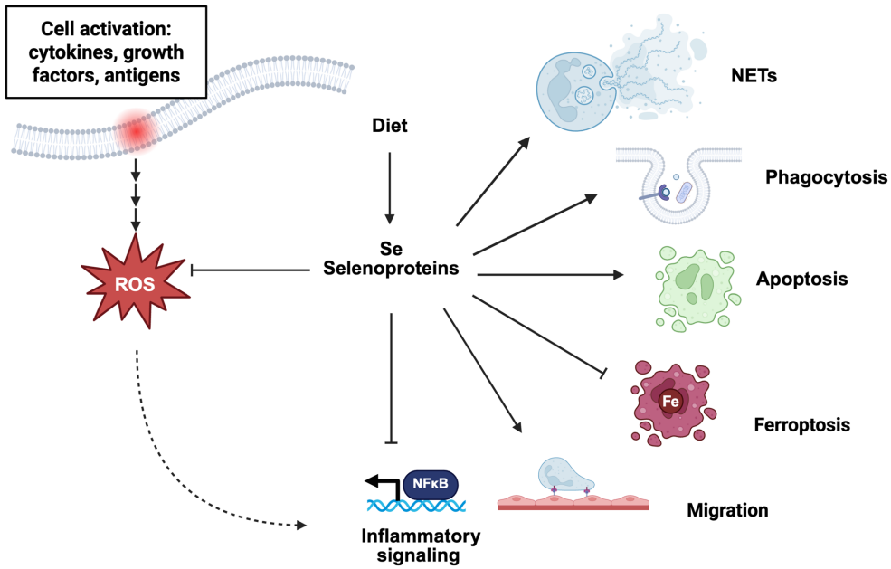 本综述系统阐述了必需微量元素硒及其功能性形式硒蛋白在中性粒细胞(先天免疫关键效应细胞)中的多维调控作用。文章聚焦于活性氧(ROS)的核心地位,详细解析了硒/硒蛋白如何通过调节NADPH氧化酶(NOX)复合物、脂质介质(如LTB4、12-HETE)代谢、炎症信号通路(NF-κB、NLRP3 inflammasome)及细胞死亡方式(凋亡、ferroptosis),进而精细调控中性粒细胞的趋化、吞噬、NETs形成、炎症因子释放及凋亡等关键功能,为相关炎症性疾病(如IBD、RA)的机制研究与靶向干预提供了新的视角。