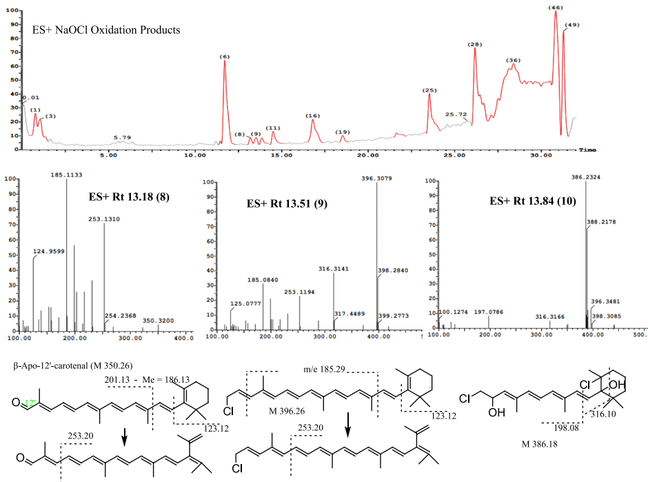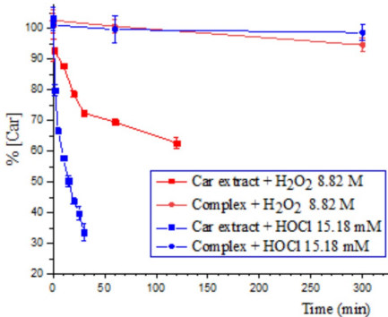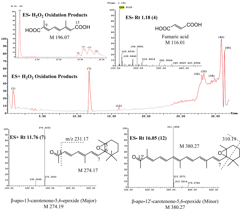 本研究针对活性氧(H2O2和HOCl)诱导的胡萝卜类胡萝卜素氧化降解问题,通过LC-MS/MS首次鉴定出apo-13-carotenone-5,6-epoxide等关键氧化产物,阐明其降解动力学机制,并开发出壳聚糖-TPP包封体系,使类胡萝卜素在300分钟内保持94%以上稳定性,为食品和医药行业提供高效抗氧化保护方案。