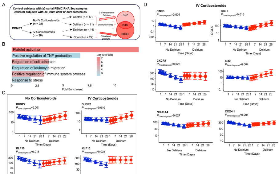 本研究针对COVID-19住院患者谵妄发生机制不清的问题,通过纵向追踪外周血单核细胞(PBMCs)转录组动态变化,发现谵妄患者存在先天免疫基因(如CCL2、CR1L)持续上调和适应性免疫基因(如CXCR3、CD28)进行性下调的特征轨迹。糖皮质激素治疗虽抑制部分炎症反应,却加剧了DUSP2/KLF10等谵妄相关基因的异常表达。研究首次揭示应激颗粒组装、血小板活化等新型通路与谵妄的关联,为靶向免疫调控策略提供了转化依据。