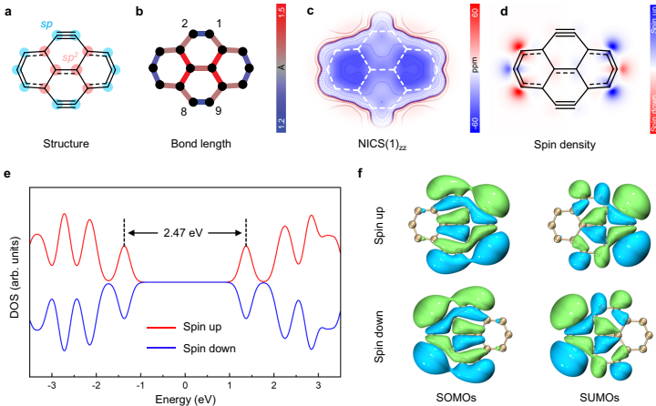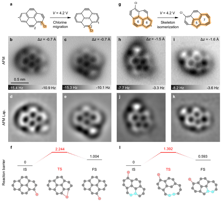 为解决分子碳同素异形体结构探索的难题,研究人员通过原子操纵技术实现了全氯化芘分子(C16Cl10)的逐级脱氯,成功在NaCl/Au(111)表面合成了具有sp-sp2杂化特征的石墨烯状C16纳米片。通过键分辨原子力显微镜(AFM)和理论计算证实其开壳层单重态基态特性,该研究为碳基材料的结构设计及自旋电子学应用提供了新范式。