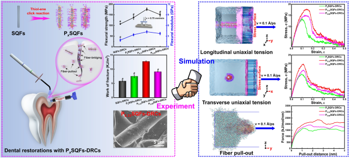 牙科树脂复合材料界面强化研究:通过硫-烯点击化学在石英纤维表面接枝MA-POSS改性层,调控接枝厚度(最佳0.86μm),显著提升复合材料的弯曲强度(+64.8%)、模量(+123.3%)、断裂韧性(+51.2%)和断裂功(+118.7%),分子动力学模拟证实界面结合强度最优,细胞实验验证生物安全性。