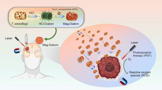 硅藻经改造为携带叶绿素的生物混合微型机器人(Mag-Diatoms),利用AI算法实现自主运动和光动力疗法(PDT)靶向治疗脑胶质瘤(GBM),体外实验显示联合治疗使细胞存活率降至3.6%-19.5%,体内模型证实可有效抑制GBM进展。