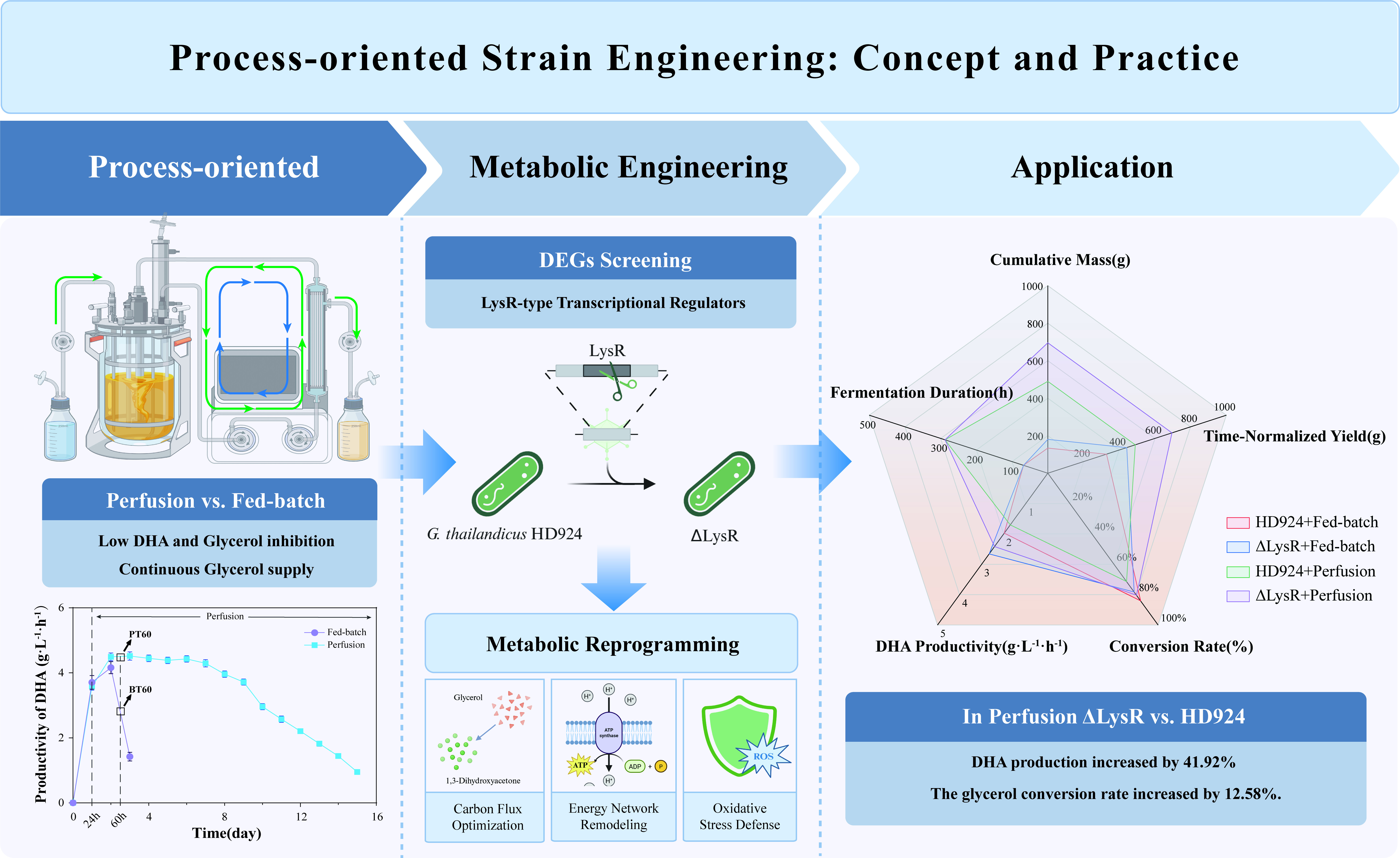该团队通过将灌流发酵与转录组学分析相结合,解析了泰国葡糖杆菌在灌流环境下的全局转录响应特征,筛选出对工艺变化高度敏感的LysR型转录调控因子,并进一步构建ΔLysR工程菌株。多组学分析表明,该工程菌株发生了碳流分配调整、能量代谢重塑及抗氧化防御相关通路的响应变化。在此基础上,工程菌株在灌流条件下表现出显著提升的生产性能,DHA产量提高41.92%,累计产量达到695.60 g,同时转化率提高12.58%,实现了菌株性能与工艺环境的协同优化。该研究为高附加值化学品的连续化、生物制造提供了新的技术路径与理论依据。